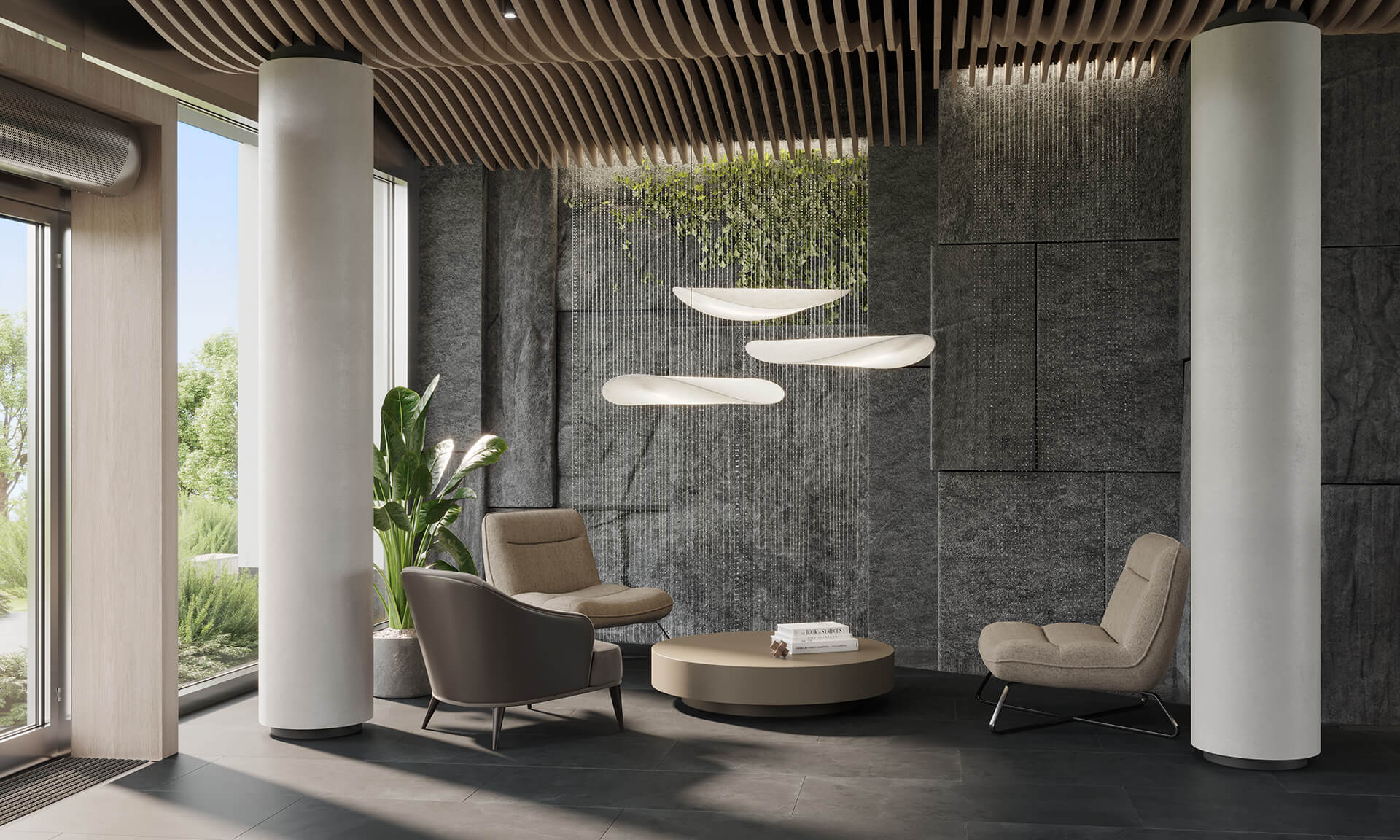 Материалы подобраны так, чтобы оставаться актуальными вне трендов: натуральный камень, тёплое дерево, текстурные поверхности, мягкий свет и фактура воды. Лобби не демонстрирует статус — оно говорит о нём спокойно. Тишина здесь не пустота, а дорогой интерьерный акцент.