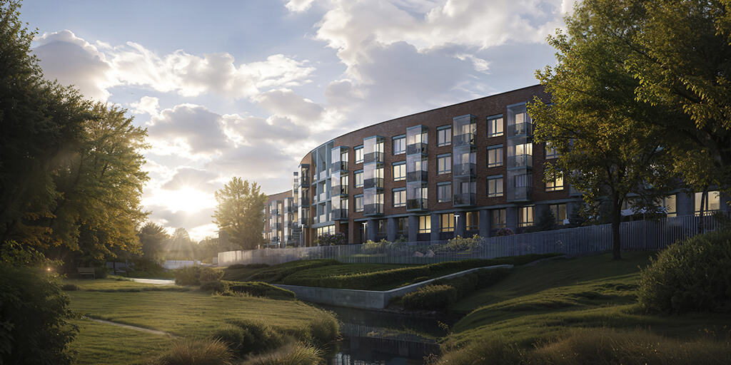 Фасад дома «Цвет Зеленогорска» — это пластика северного модерна, прочитанного современным языком. Терракотовый кирпич впитал закатные тона Зеленогорской ривьеры, а лазурные акценты отражают морскую волну и свет Финского залива. Волнообразная геометрия напоминает течение Жемчужного ручья, который проходит у дома, — архитектура продолжает природную линию, превращая пространство в живую метафору курорта. Объём не давит, а раскрывает, оставляя место свету, воздуху и взгляду.