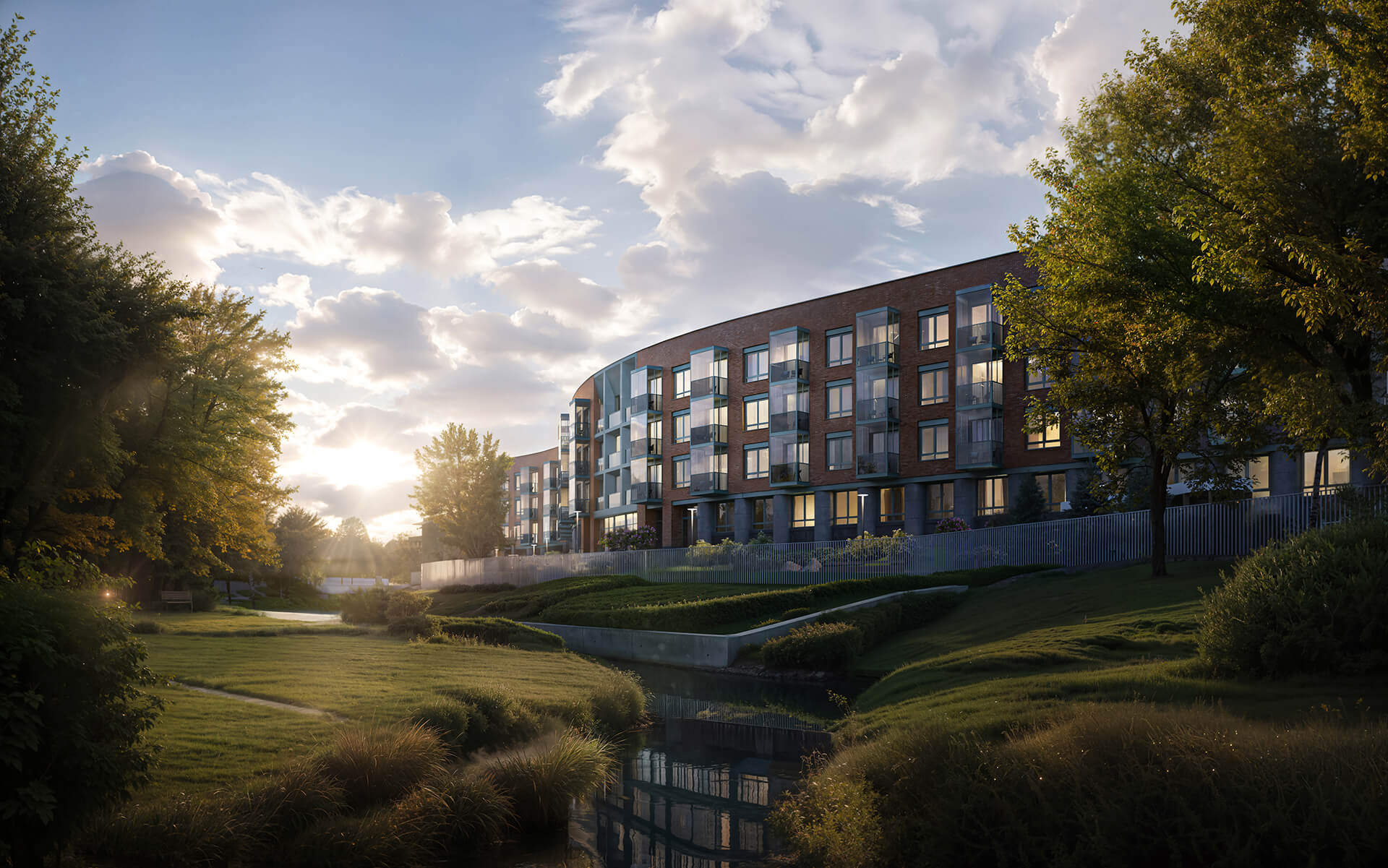 Двор жилого комплекса «Цвет Зеленогорска» — пространство без автомобилей, без суеты, без напора функций. Здесь ритм жизни задаёт сад, свет и звук Жемчужного ручья. Ландшафт выстроен в мягких линиях, повторяющих фасад, и разворачивает сценарий созерцательной прогулки: тенистые участки сменяются солнечными, дорожки ведут к амфитеатру, а пергола растворяется в зелени. Это двор, где можно быть, а не что-то делать.