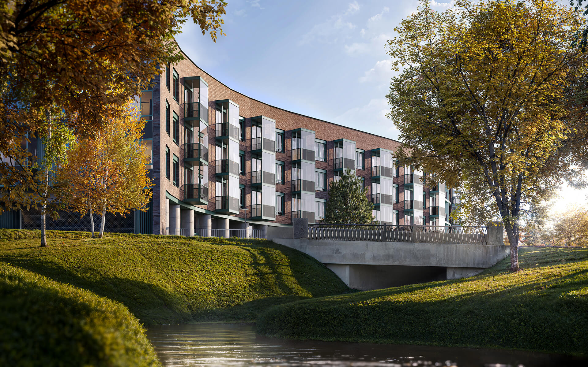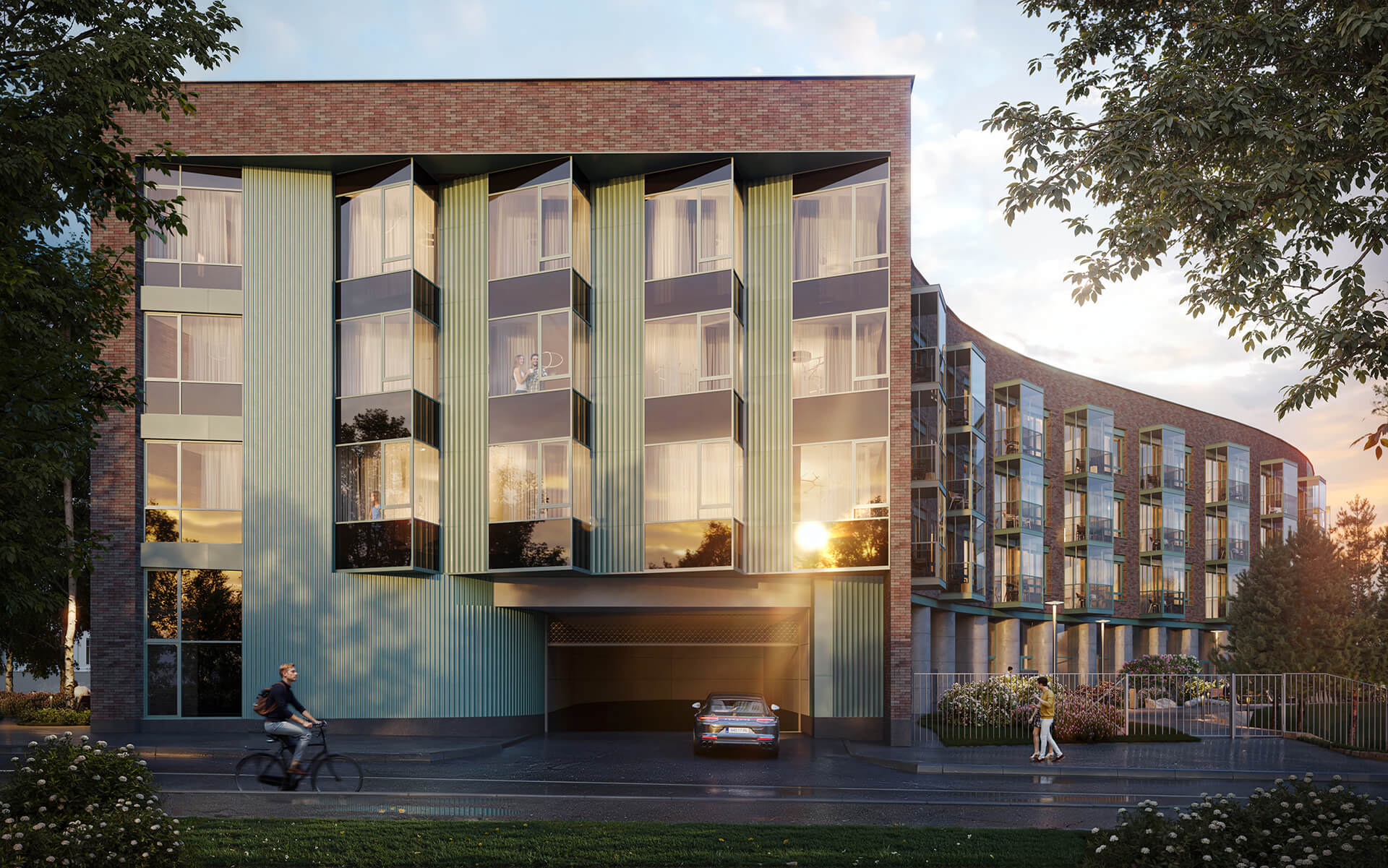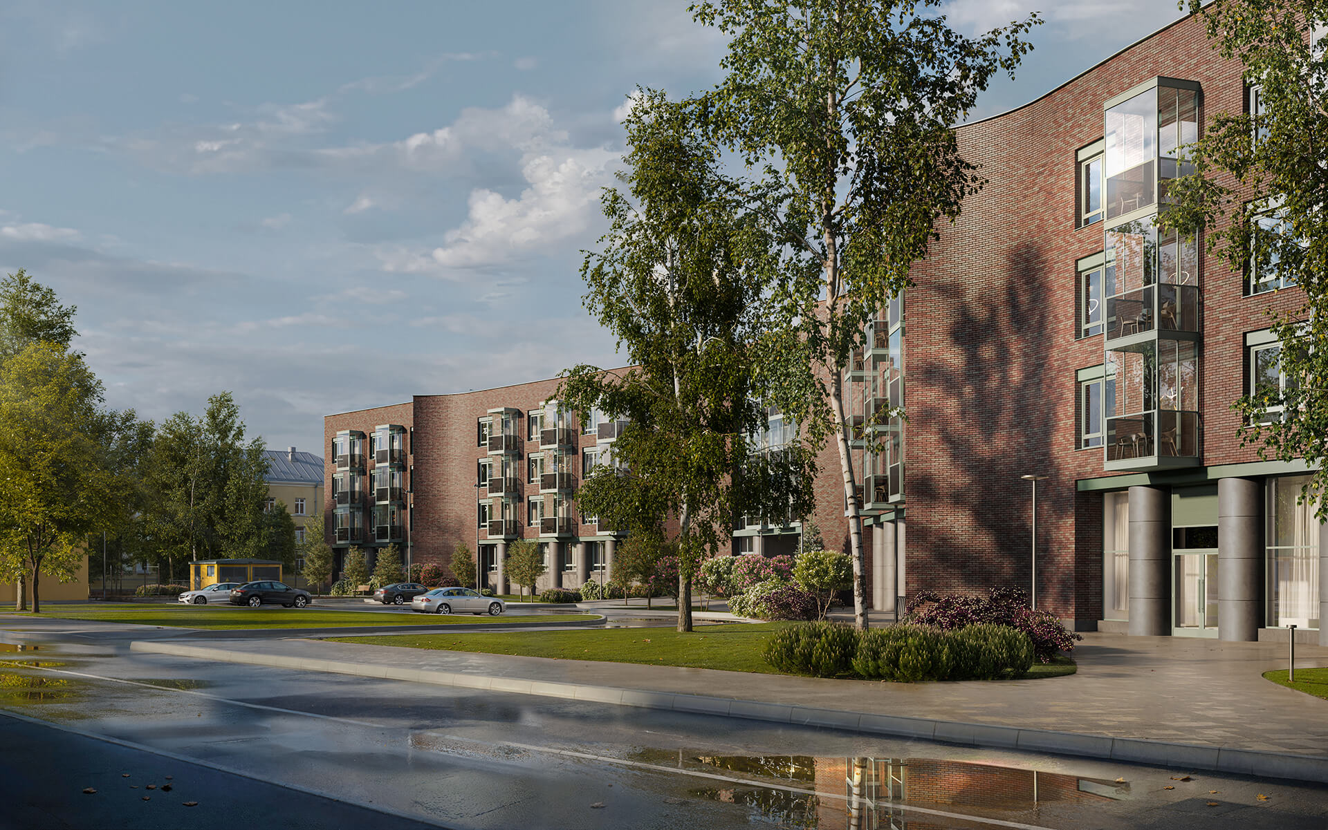 Фасад дома «Цвет Зеленогорска» — это пластика северного модерна, прочитанного современным языком. Терракотовый кирпич впитал закатные тона Зеленогорской ривьеры, а лазурные акценты отражают морскую волну и свет Финского залива. Волнообразная геометрия напоминает течение Жемчужного ручья, который проходит у дома, — архитектура продолжает природную линию, превращая пространство в живую метафору курорта. Объём не давит, а раскрывает, оставляя место свету, воздуху и взгляду.