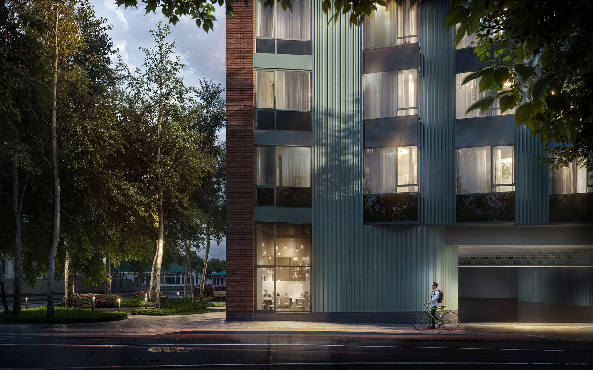 Дом «Цвет Зеленогорска» повторяет человеческий масштаб. Высота намеренно снижена, чтобы сохранить ощущение приватности и не превратить вид из окон в урбанистический монолог. Вечерняя подсветка подчеркивает мягкость фасадного рельефа: кирпич словно согревается, волны металла становятся глубже, тени — длиннее. Архитектура становится не просто оболочкой, а атмосферой, в которой хочется быть.