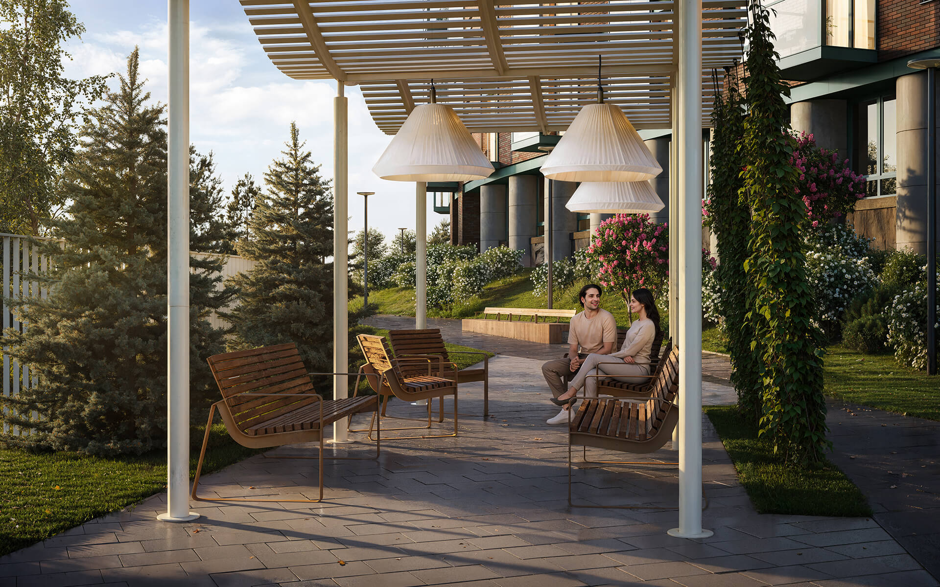 Вечером освещение превращает пространство в курортную декорацию: мягкие светильники, тёплые абажуры, игра теней. Двор становится театром тихих встреч. Здесь создаются сценарии, где нет места срочности. Детская площадка остаётся природной: дерево, песок, рельеф как в саду. Это курорт детства без пластиковых форм.